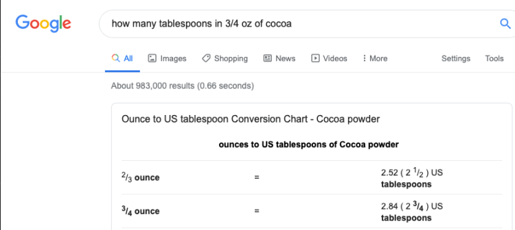 In this case we should multiply 4 fluid ounces by 1.9999999999932 to get the equivalent result in tablespoons: